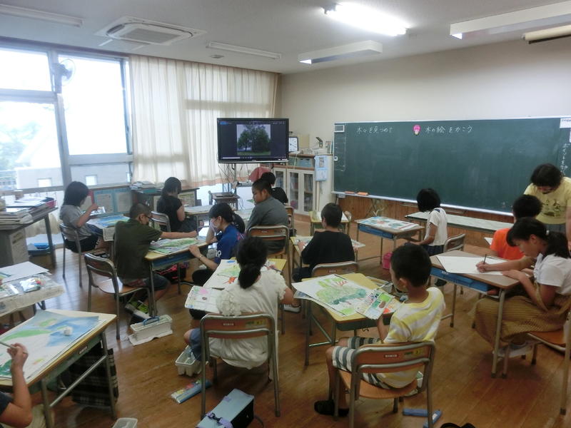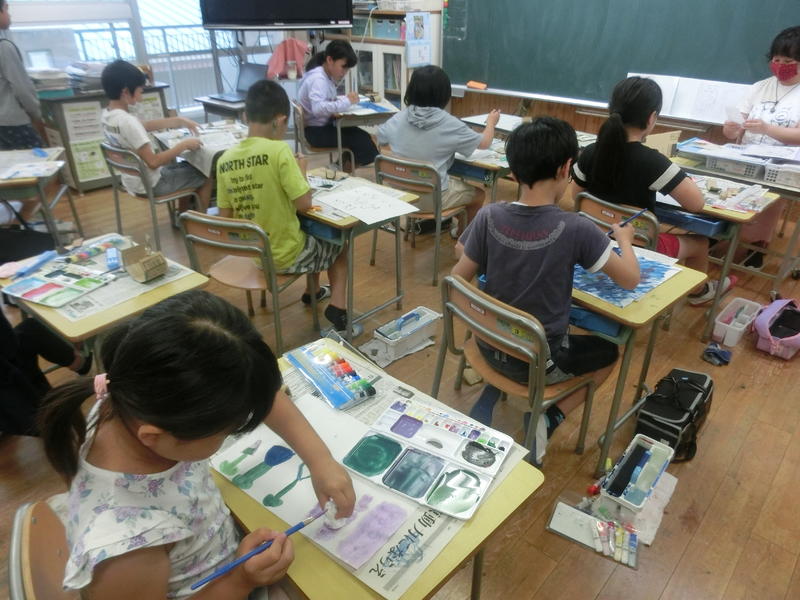 4年、図工「木々を見つめて」。これまで学んだ混色を生かして、題材の「木」を、葉っぱ一枚一枚丁寧に色付けしていました(^^)/