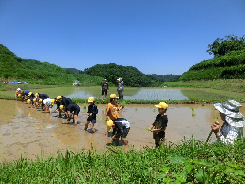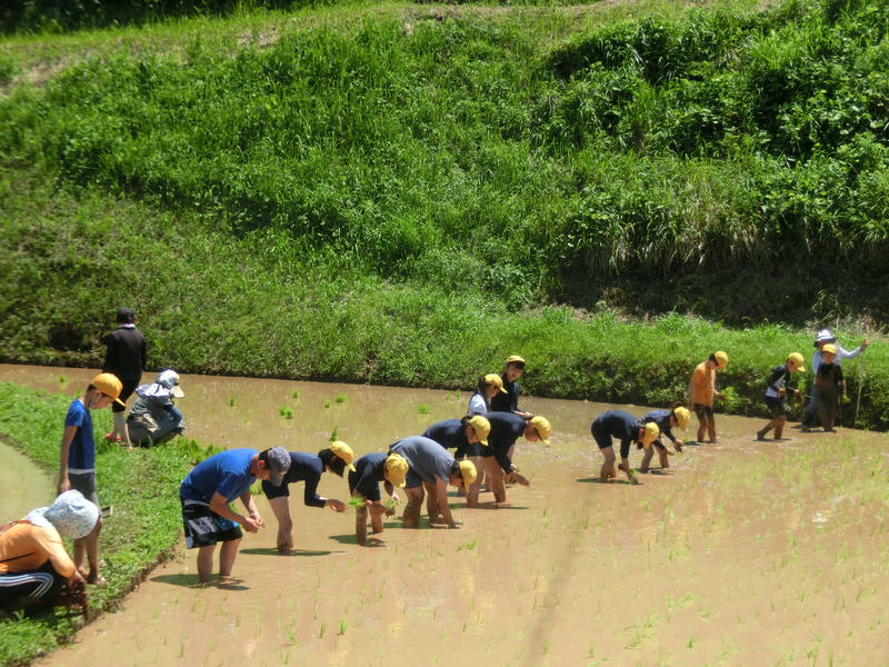 5年生が「田植え」をしました。川口勝行さん所有の田んぼで田植え体験をすることができました。川口さんには田んぼの準備をはじめ、餅米の苗も用意していただきました。また、藤本早苗さんにもお手伝いに来ていただき、苗の植え方をご指導いただきました。ありがとうございました。育てられた餅米は12月の餅つき会で使用します。たくさんの餅米が収穫できるのを楽しみに、これから稲の生長を見守りましょう!