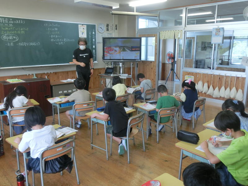 もう一つ、1年生、図工「いろいろならべて」。折り紙をならべてステキな世界を表現していました。色鮮やかに工夫されたライオンや魚や恐竜などが完成。みんなで鑑賞会をしていました。