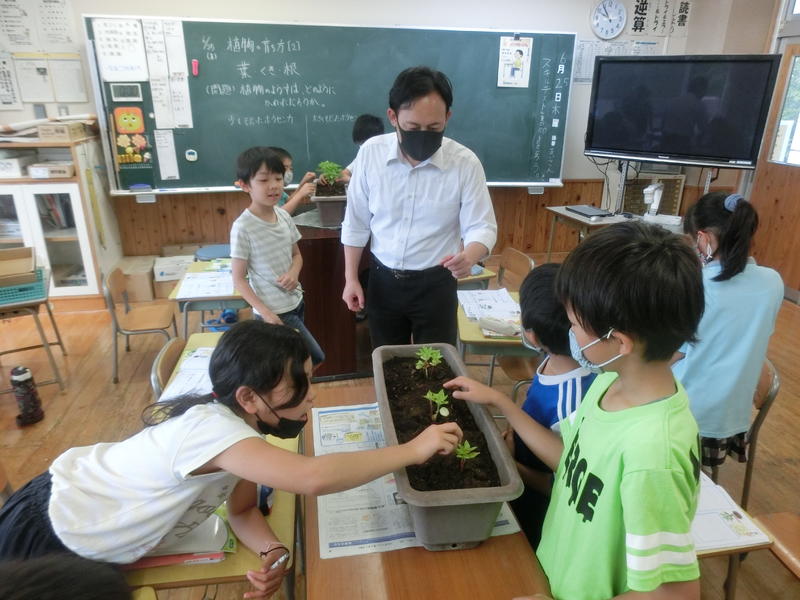 3年、理科。ホウセンカの観察。「茎がガザガザしている」、「葉っぱの色が濃い」など生長したものと比べながら詳しく観察をしていました。