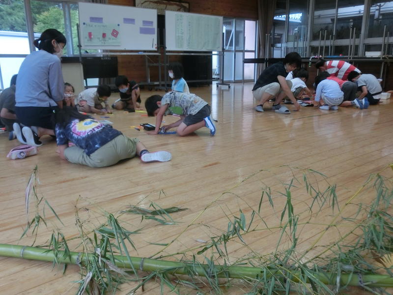 七夕様の飾りつけをしました。保護者の久保田幸生さんが今年も竹笹を用意してくださいました。ありがとうございました。学校の中央階段に飾ります。ご来校の際はどうぞご覧ください(^^)/