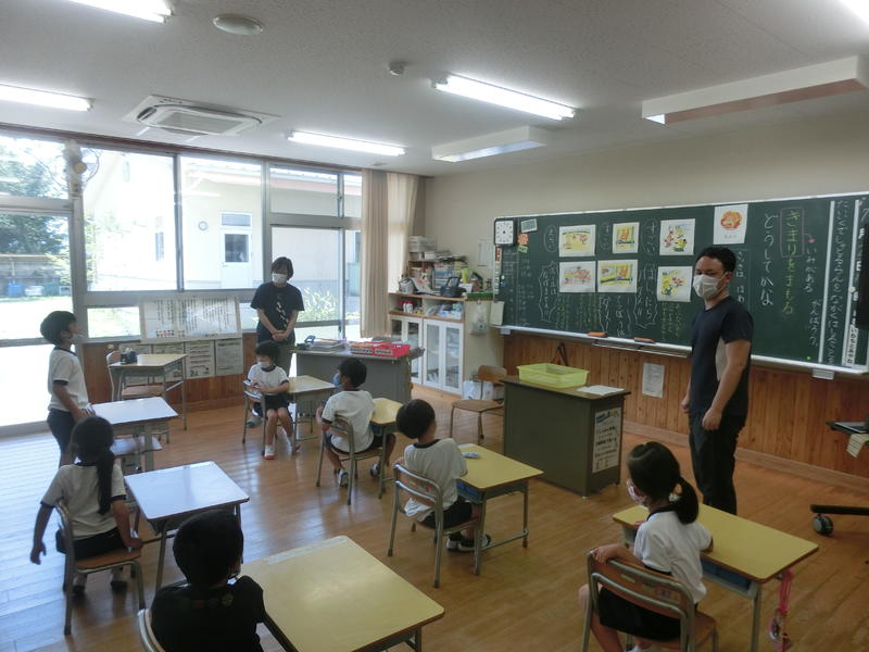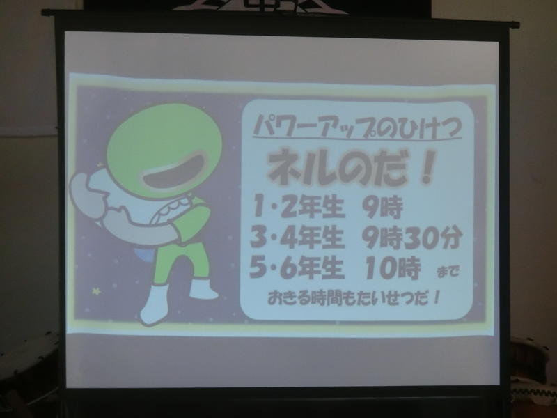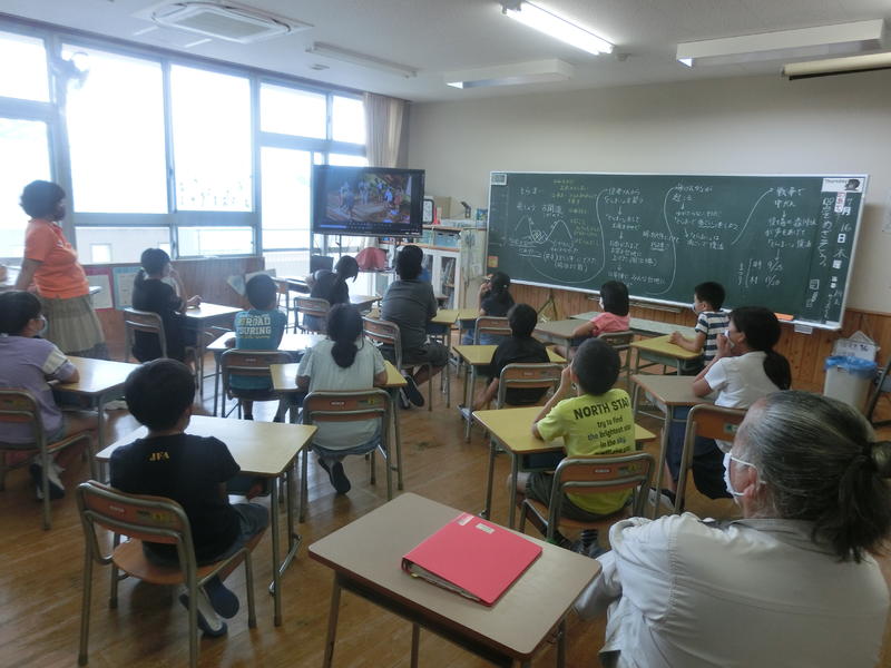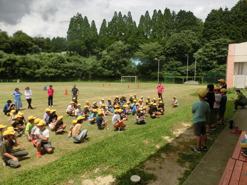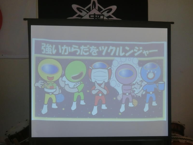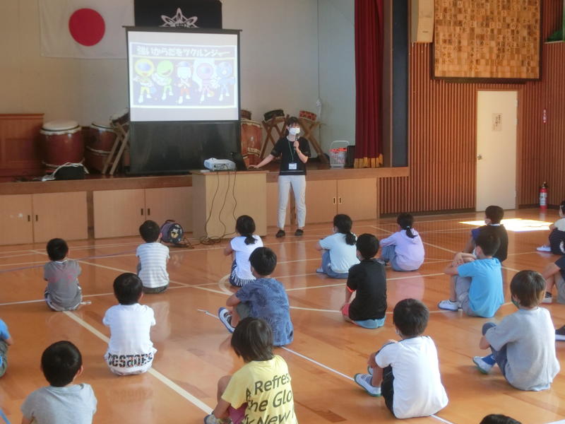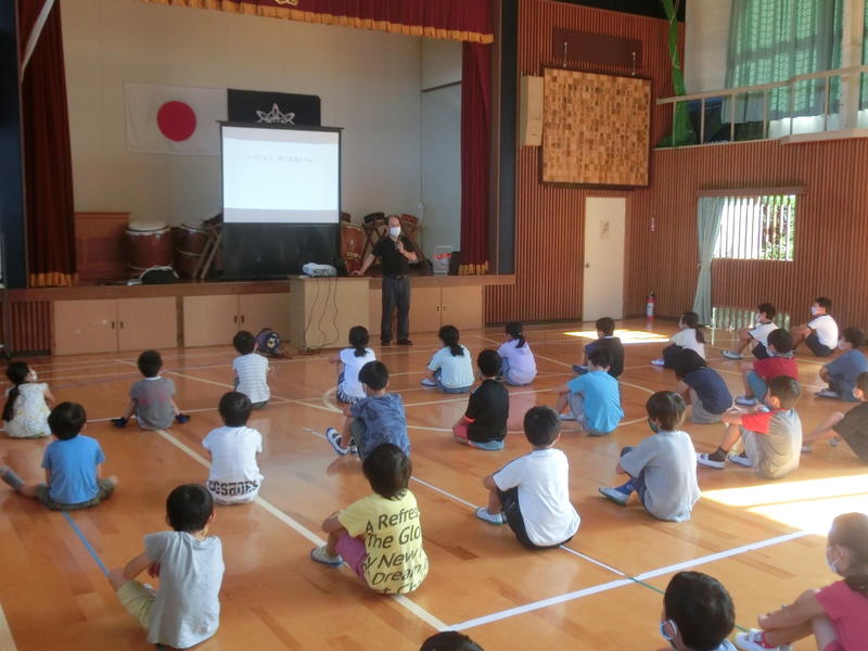 金曜集会。「夏休みの安全と健康なくらし」についてお話がありました。安全面のお話では「なつやすみ」の頭文字に続けて、「つ=つづけよう生活リズム」など。また、健康面では「強い体つくるんジャー」のキャラクターをもとに楽しく、子どもの心に残るお話をしてくださいました。