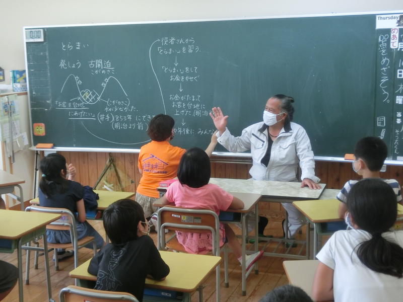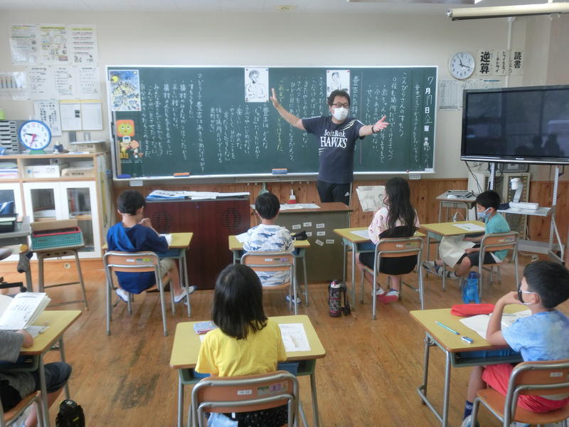 4年生は、上野古閑迫寅舞保存会代表の川部一光さんをゲストティーチャーにお迎えして、「寅舞」の由来などについて詳しくお話を聞きました。寅舞に取り組む意欲がグーンと高まりましたね。川部一光さんには、今後舞のご指導にも来ていただきます(^^)/