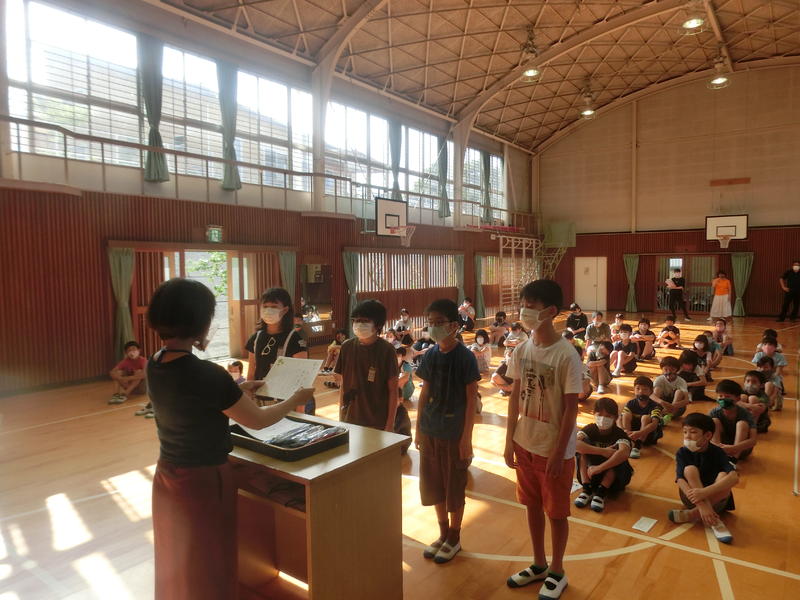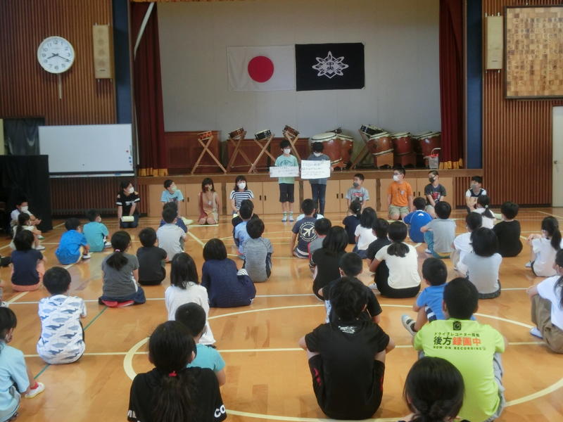 火曜集会。7月の生活目標(元気のよいあいさつと返事をしよう、熱中症の予防をしよう)の振り返りがありました。今月は代表で3・4年生が発表しました。「1日30人以上の人に挨拶することを頑張りました。」や「3ゴク(休憩ごとに熱中症防止のために3口水を飲む)を毎日できました。」など、具体的に振り返りができました。