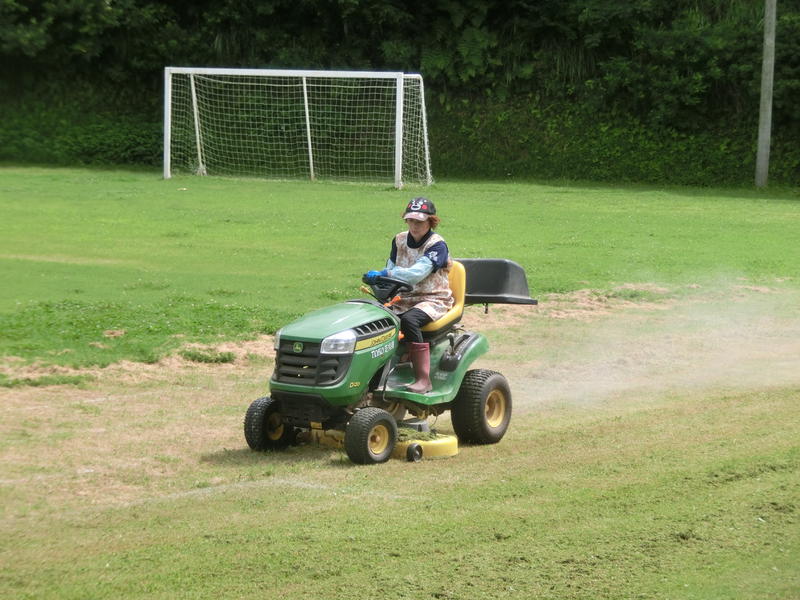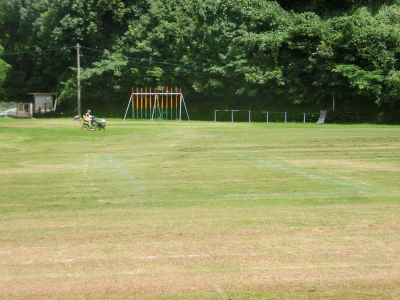朝から用務員の田中君子先生が、草刈り機で芝生の草刈りをしてくださいました。おかげでとてもきれいになり、子ども達が気持ちよく運動場で遊べます(^^)/ 草刈り機の操作も見事です!