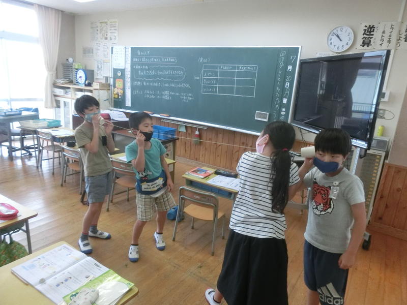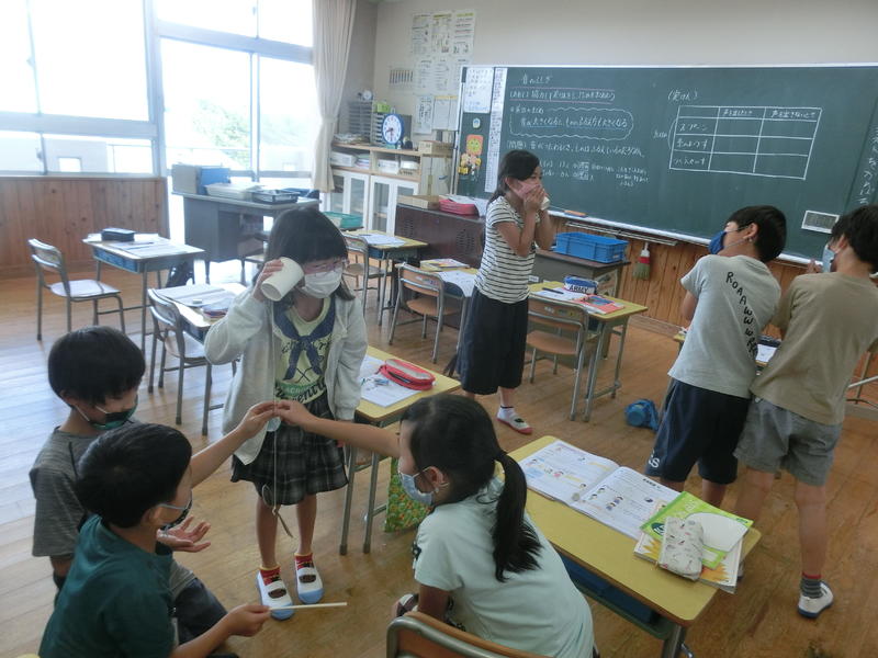 3年、理科「音のふしぎ」。音の伝わり方の不思議を学習していました。音が伝わるときは振動することが分かりましたね。「うわー!」「すごい!」と歓声が上がっていました(^^)/