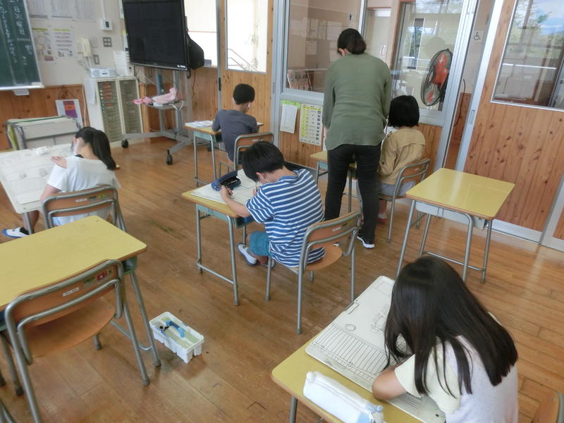 5年生は図工で、風景画を描いていました。葉っぱ一枚一枚丁寧に描いている子、遠近感を工夫している子もいました。出来上がりが楽しみです(^^)/