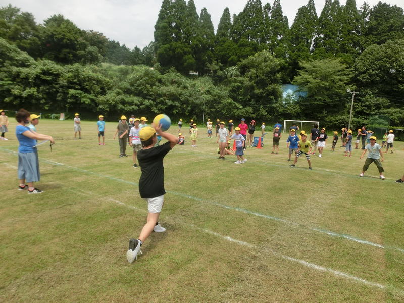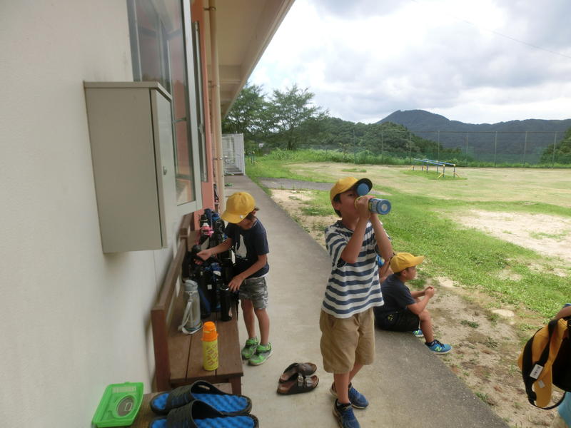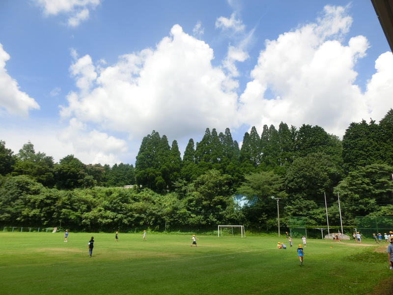 昼休み。梅雨明け、快晴でした。緑の芝生で多くの子どもが外遊びを楽しんでいました。空も芝生も、とてもきれいですね!ご家庭には毎日の水筒の準備、大変お世話になっています(^^)/