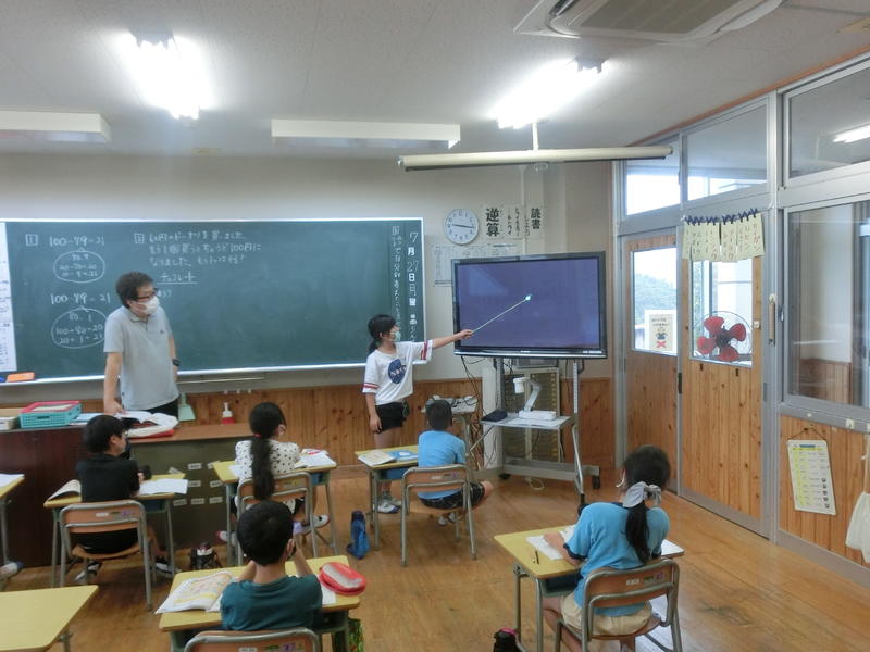 3年生は、算数「数をよく見て暗算しよう」の学習。実物投影機を使って、自分の解き方の説明を分かりやすく行っていました。差し棒の使い方が様になっていますね(^^)/