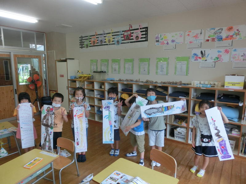 1年生は図工「ながーい、かみから」を学習。長い紙をうまく使って、自分だけの世界を表現していました。