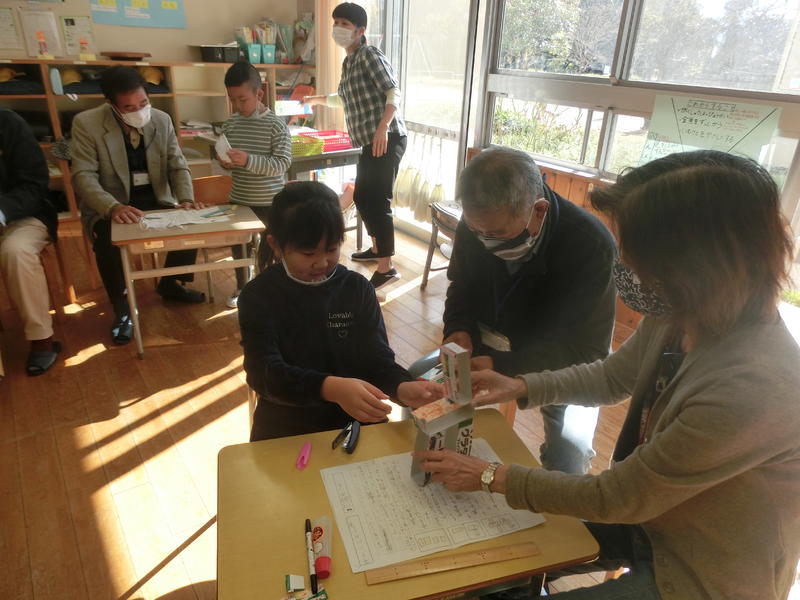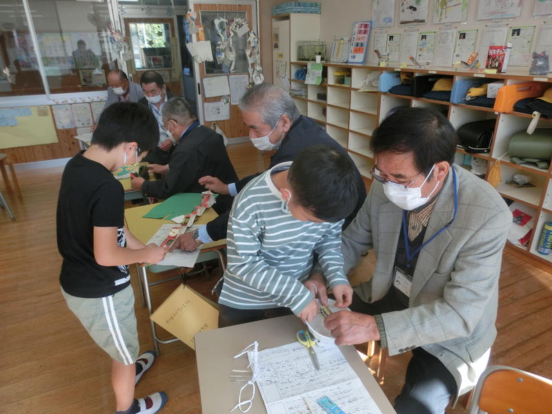 花丸2年生は「おもちゃの作り方」を学習しました。学習応援団(上野地区)の皆様にサポートをしていただきました。国語で学習した子どもたちのおもちゃ作りの説明文にそって、アドバイスをもらいながら一緒におもちゃ作りをしました。