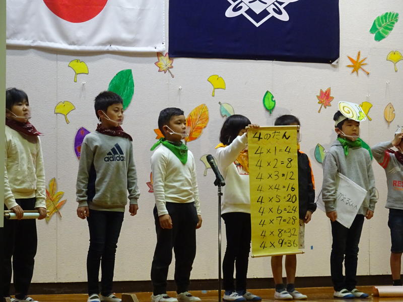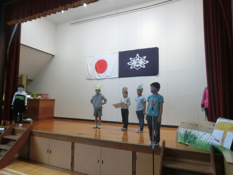 2年生の演目は「お手紙」。国語で学習した「お手紙」のお話を工夫して発表しました。かたつむりくんは、お手紙を届ける途中に、体操やかけ算、音楽会に参加しました。2年生の今までのお勉強の成果や成長がよく分かる発表でした。