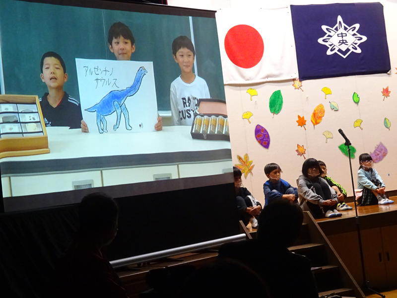 3年生の演目は「トリビア オブ ダイナソー」。ミフネリュウを始め、「恐竜」について学んだことをテレビ番組風にして発表しました。分かりやすい発表でみんなが恐竜博士になりました。「20へぇー獲得!!」