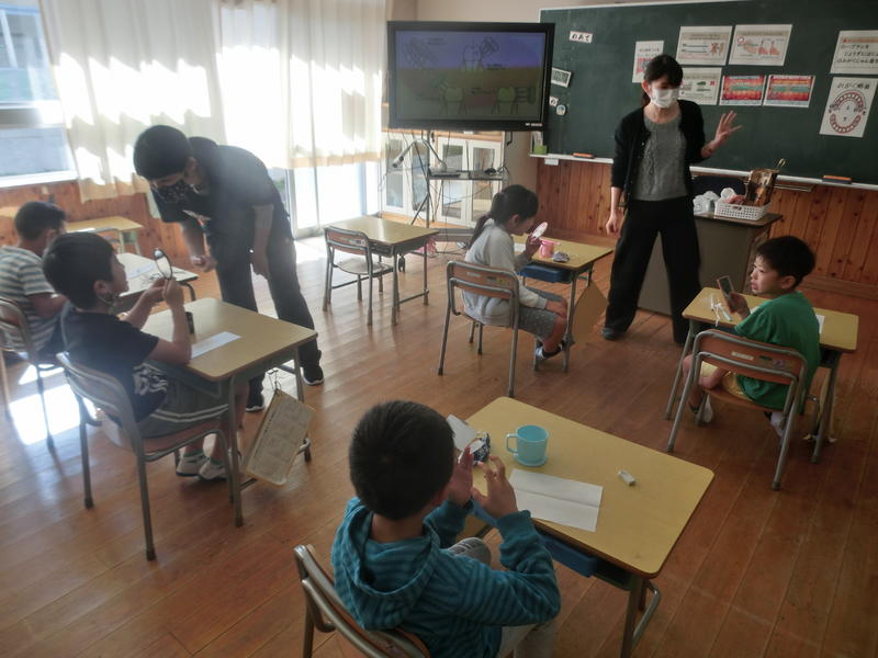 4年生は外国語の学習をしていました。「何が欲しいですか」の英語表現を練習していました。英語を使って集めたフルーツで、オリジナルのパフェを作っていました。「もっとバエ(映え)させるね!」と言って色塗りをしていました。うーん、バエてますね(^^)/