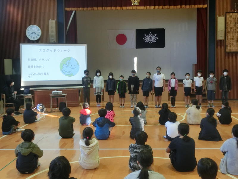 火曜集会。「体育環境委員会」が環境ISOの取組についての発表をしました。昨年度との比較をしながら、「節水、節電、ごみ削減」の呼びかけをしました。各学級で「エコグッドウィーク」に取り組みます(^^)/