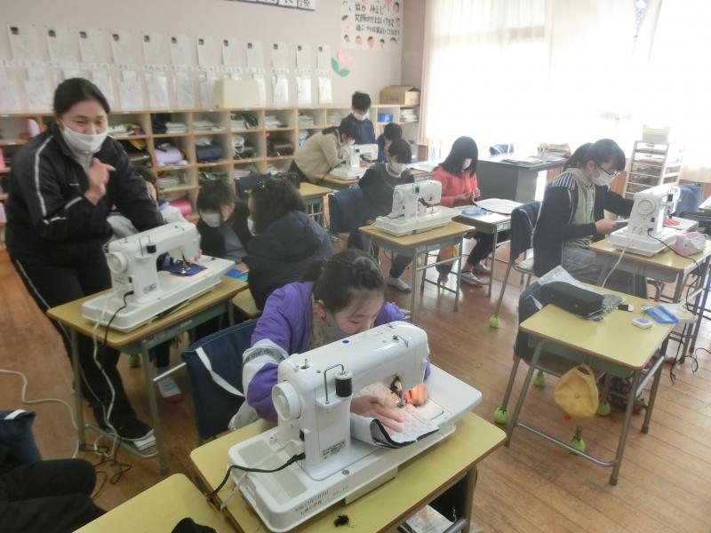 5年生は家庭科「ミシンにトライ!手作りで楽しい生活」を学習していました。5年生にとって初めてのミシン操作、友達と協力してミシン縫いを頑張っていました。ナップサックの完成か楽しみです(^^)/