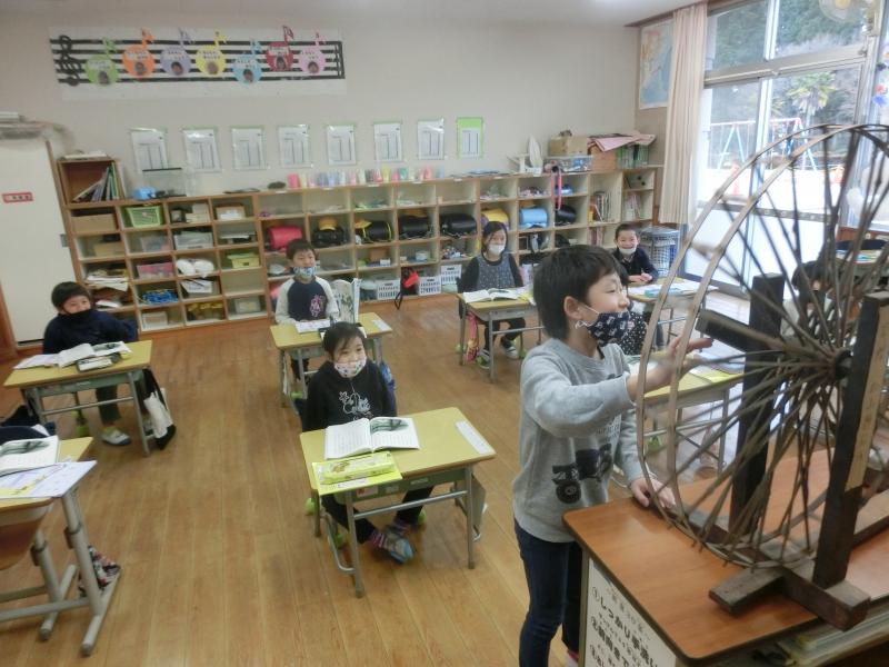 1年生は国語「たのきの糸車」を学習していました。「いろり」や「糸車」などの言葉について、1つ1つ確認して進めていました(^^)/