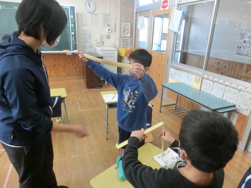 2年生は算数「長いものの長さのたんい」を学習していました。30cmものさしで1m以上の長さの計り方を考えていました。いろんな発想があって感心しました(^^)/