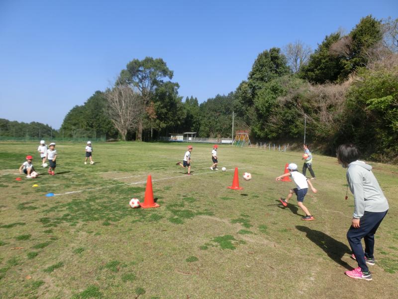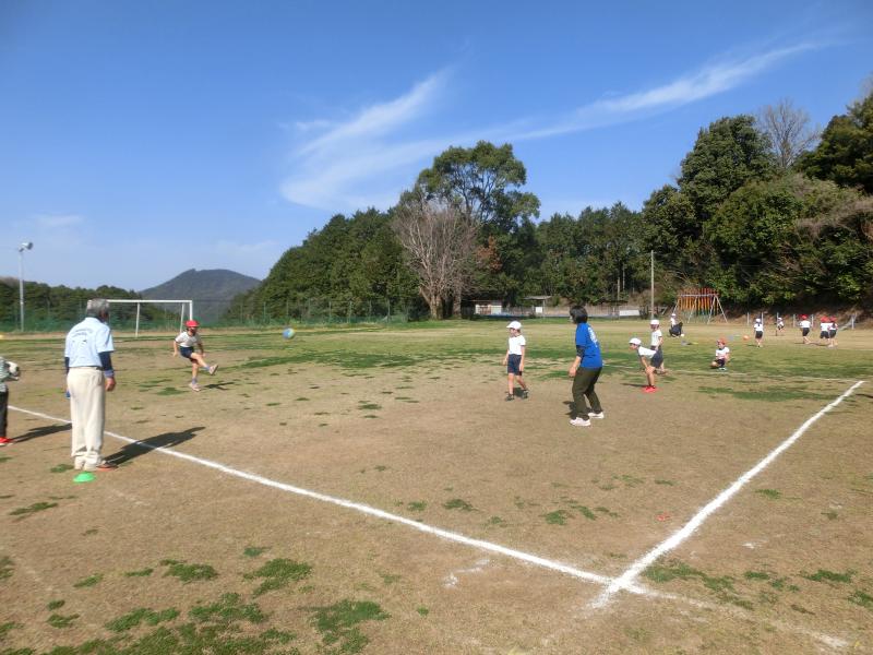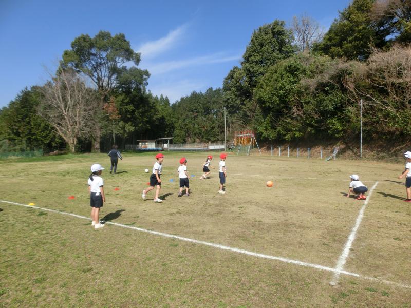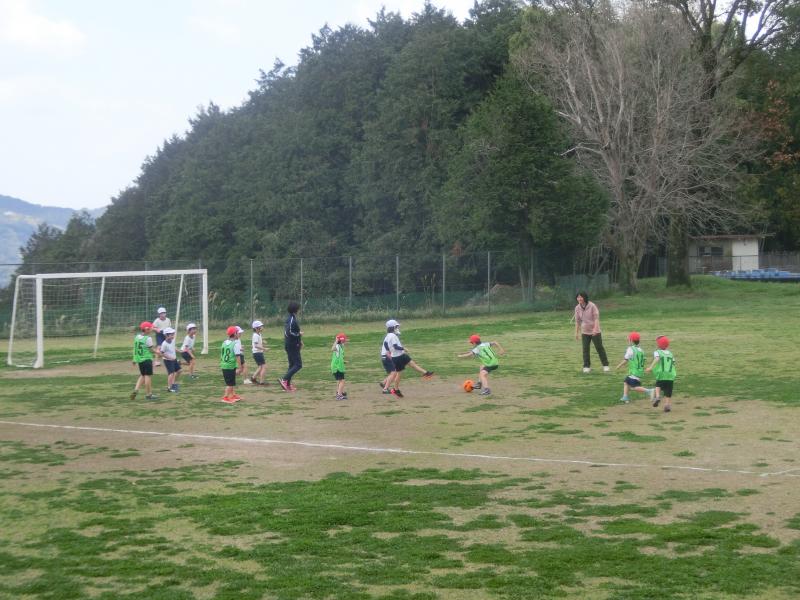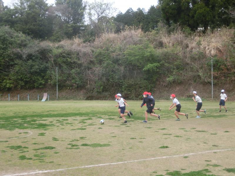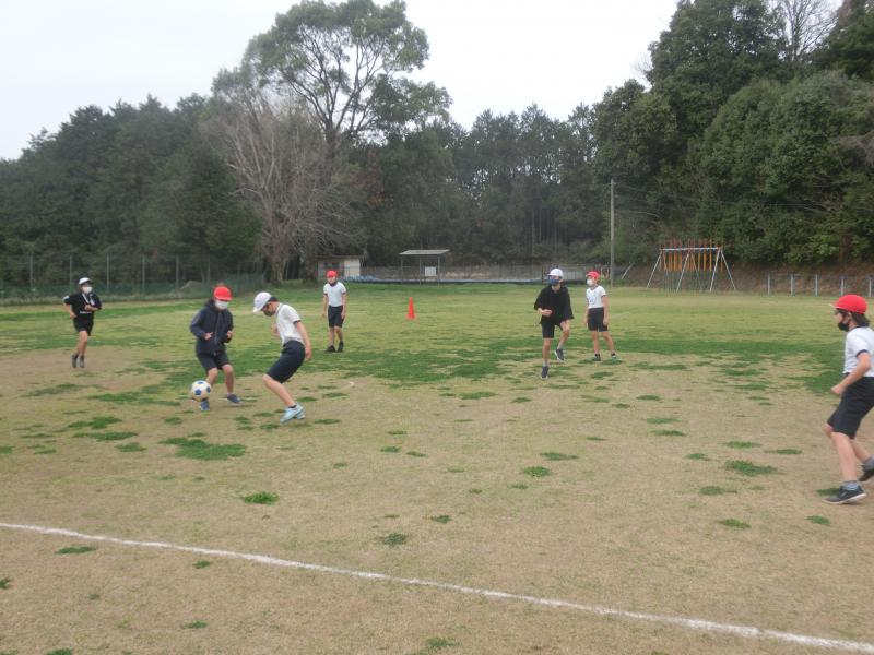 1・2年生は体育でサッカーのゲームをしていました。今日は風が冷たい日でしたが、寒さに負けずみんなボールを追いかけていました(^^)/