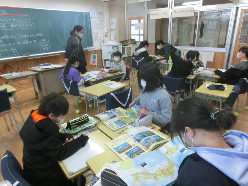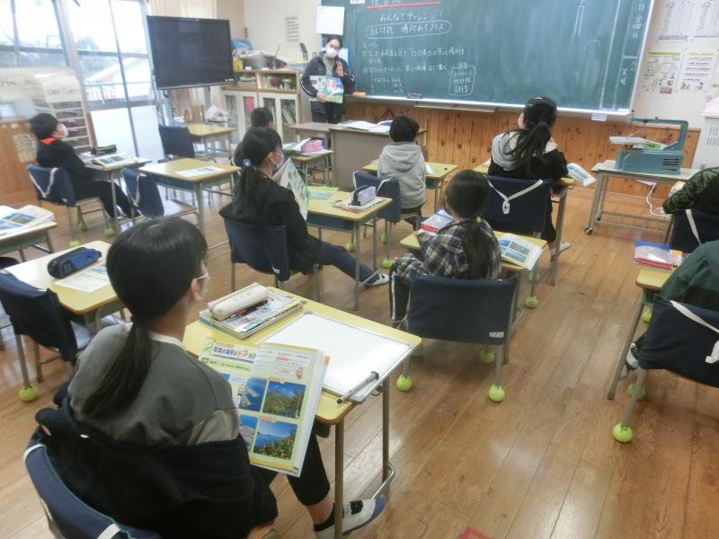 5年生は社会科で、「場所あてクイズをしよう」の学習をしていました。写真から、ここはどこから撮られたものなのか考える学習です。既存の知識や地図帳を活用する力が試されました(^^)/