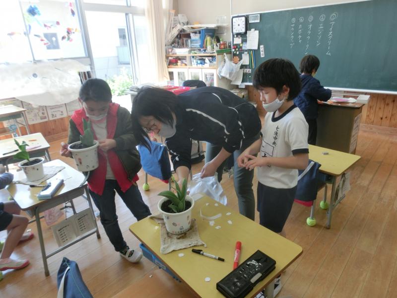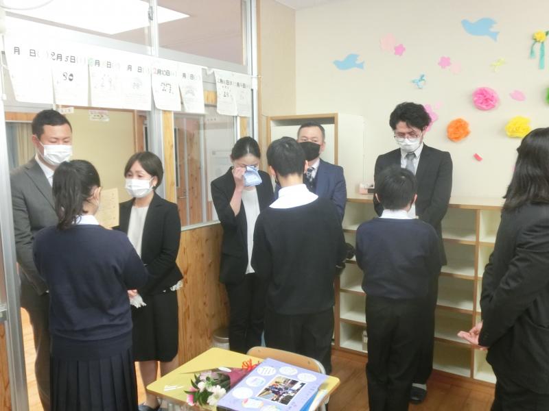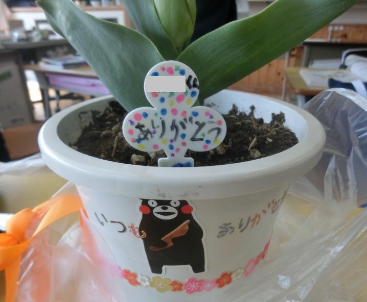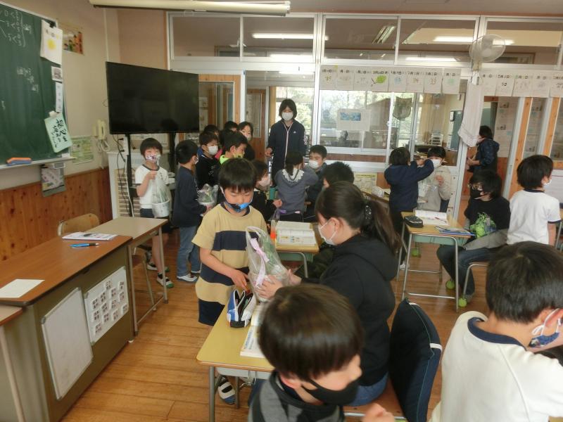 実は1・2年生、11月から6年生に贈るために、「チューリップ」をこっそり&大切に育てていたとのこと。1・2年生から6年生に「メッセージ付きつぼみのチューリップ」をプレゼントしました。1・2年生の温かい気持ち、6年生へのお別れの気持ちが伝わりましたね(^^)/