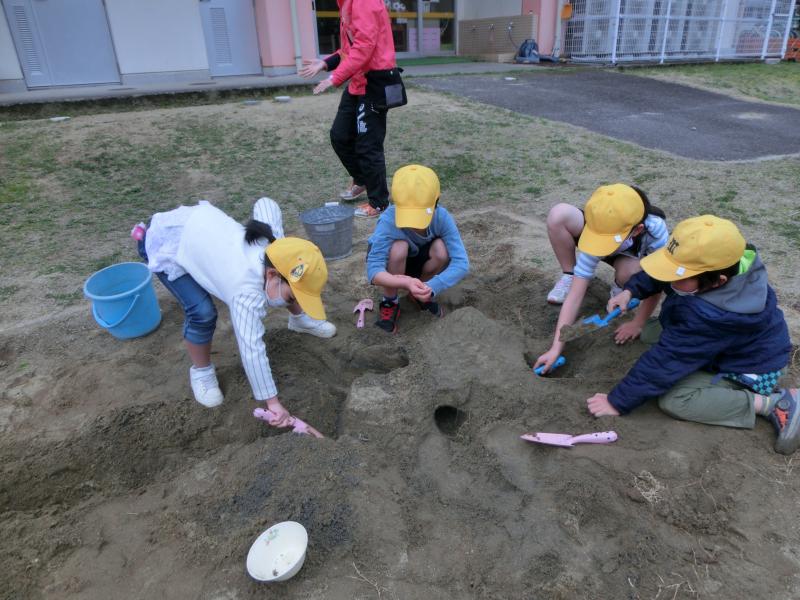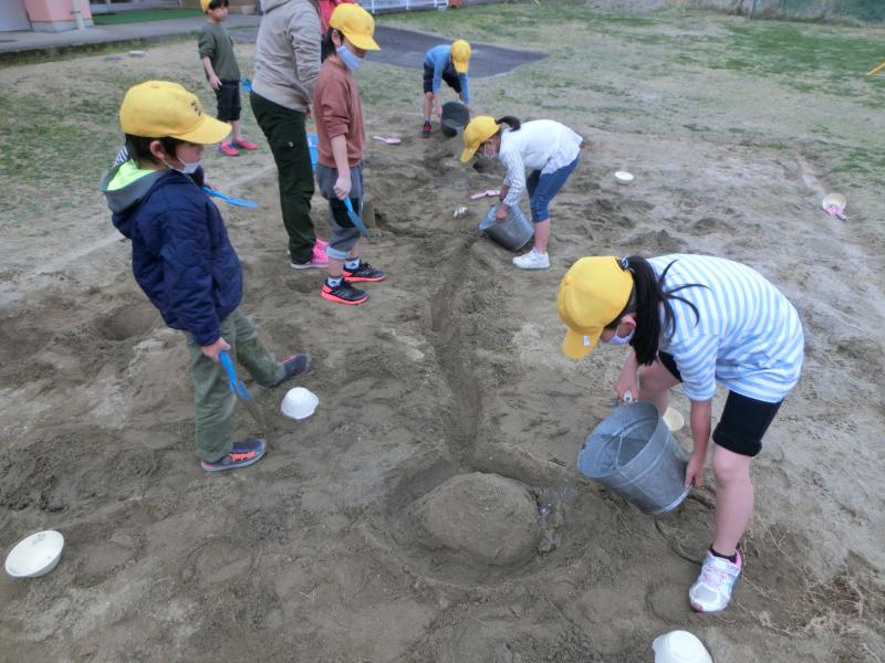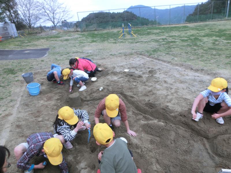 1年生は図工「つくってみよう」で、砂の造形遊びをしていました。砂を掘ったり固めたりして、砂で思い思いの世界を表現していました(^^)/