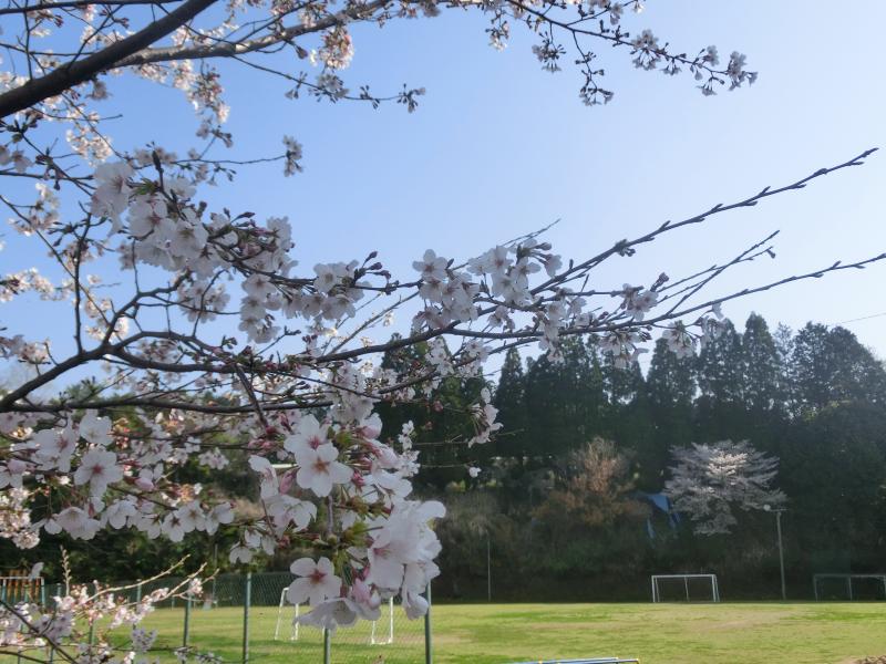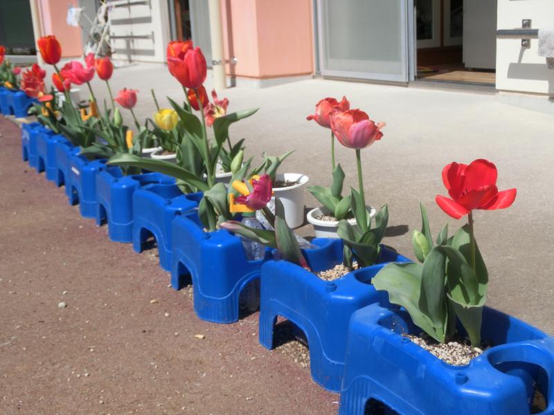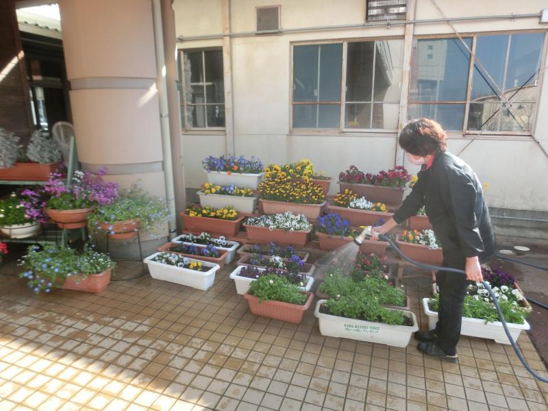 玄関前のプランター。用務員の田中君子先生が心を込めてお世話をしてくださっています。小学校の桜も咲き始めました(^^)/