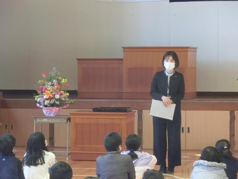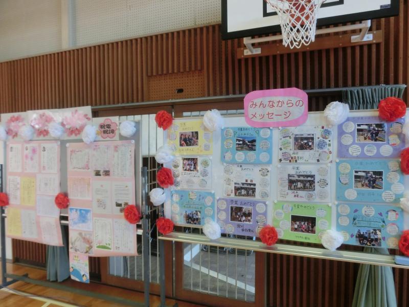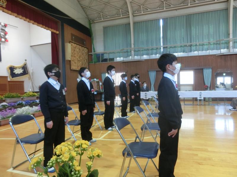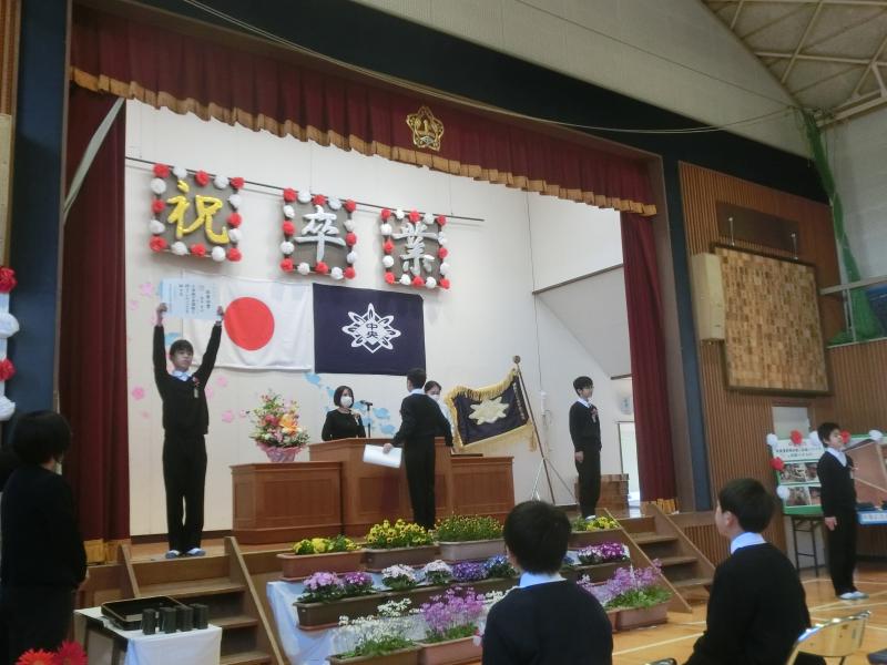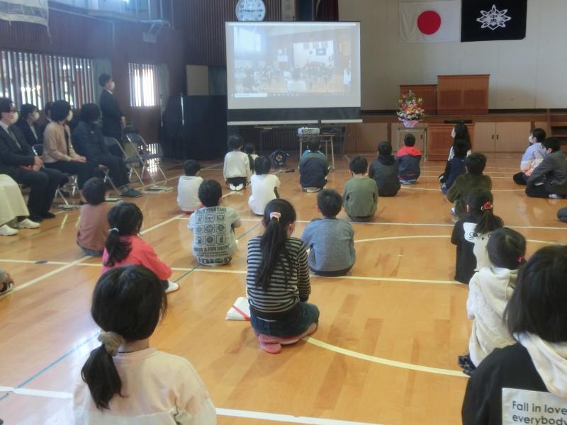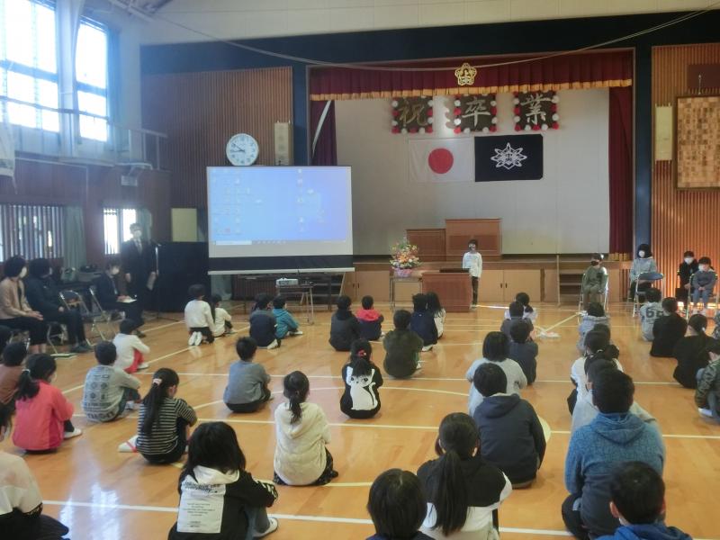 感染症対策のために、在校生は5年生のみの参列でした。しかし、1・2年生は6年生一人一人に大切に育てたチューリップを贈り、3・4年生は式中流される校歌を歌いました。在校生の気持ちはしっかり参加できた心温まる卒業式でした。