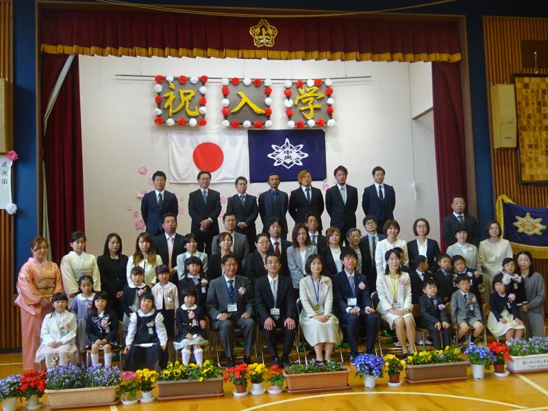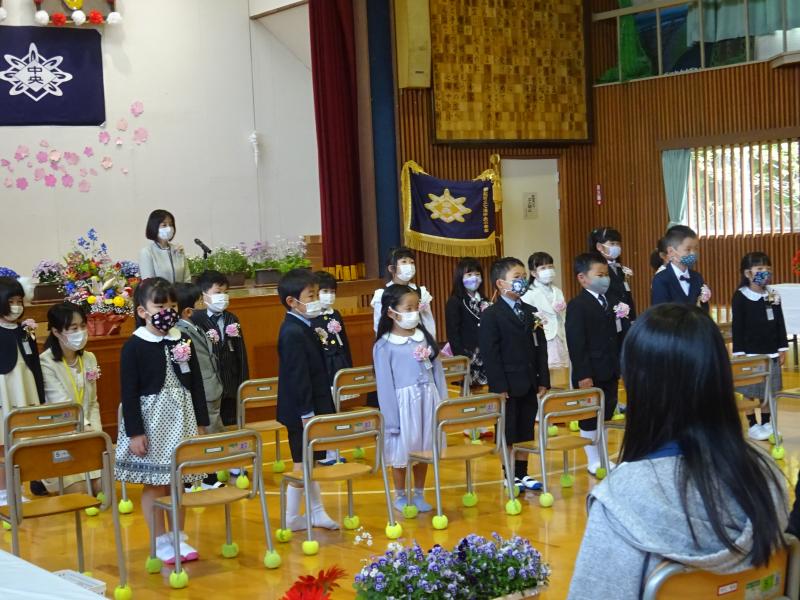 花丸ご来賓、ご家族、6年生や先生たちに見守られ、一人一人の名前を呼ばれると、元気にお返事ができるピカピカの1年生!晴れ晴れとしてあたたかい雰囲気の入学式でした。豊田校長先生からは「芝生の運動場でたくさん運動したり、木の校舎でたくさん勉強したりしましょう。」とお話がありました。