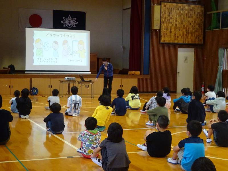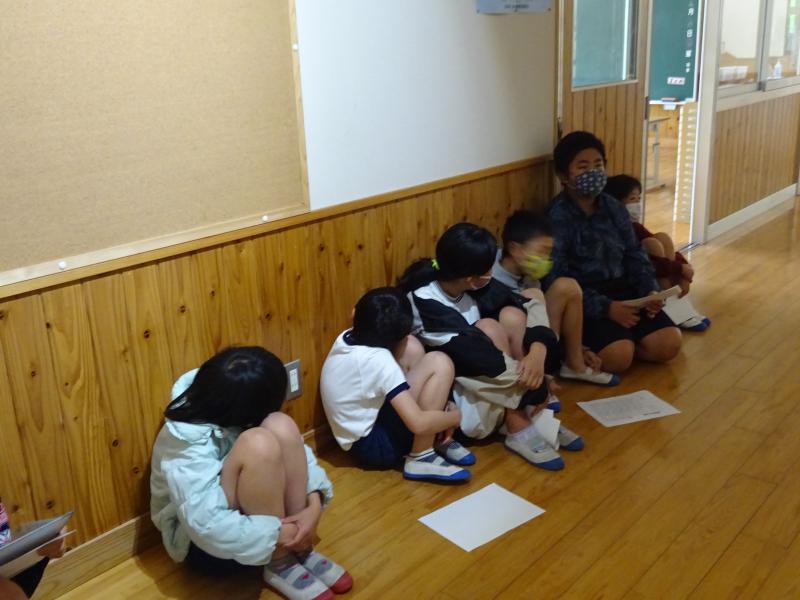 体育館に集まり、黙とうをして、校長先生から「備えることの大事さ」のお話を聞きました。枝川先生から避難する時の注意を聞いて、訓練です。