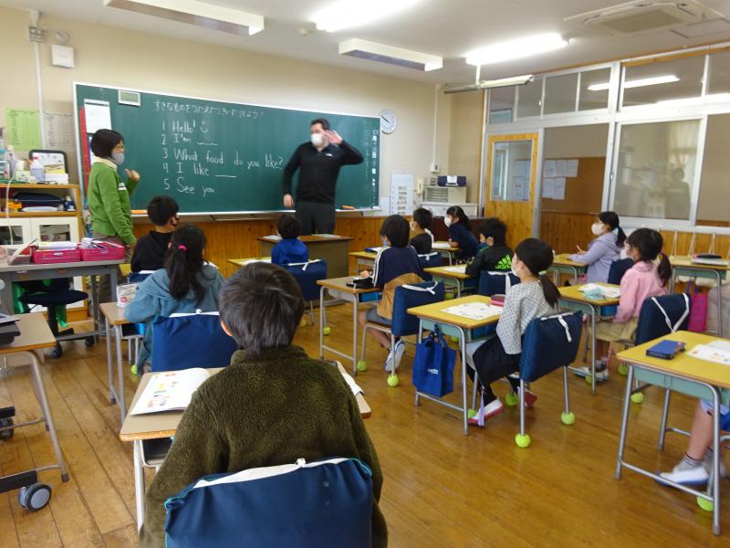 5年生は、英語専科の齋賀先生と英語の会話の学習をしていました。好きなものを英語で伝え合えたかな?
