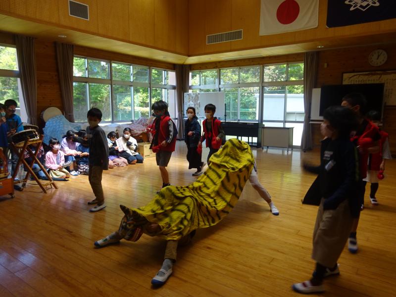 4、5年生は合同で寅舞の学習をしました。まず「子ども芸術祭2020in上益城」で発表した「寅舞誕生物語」の舞台を観て勉強、そして4年生は舞ってみました。5年生は舞のコツを4年生にしっかりと伝えていました。4年生も大分舞えるようになってきました!