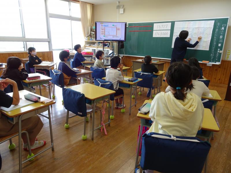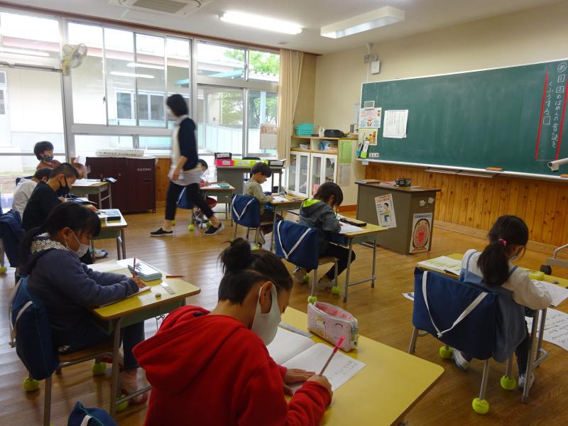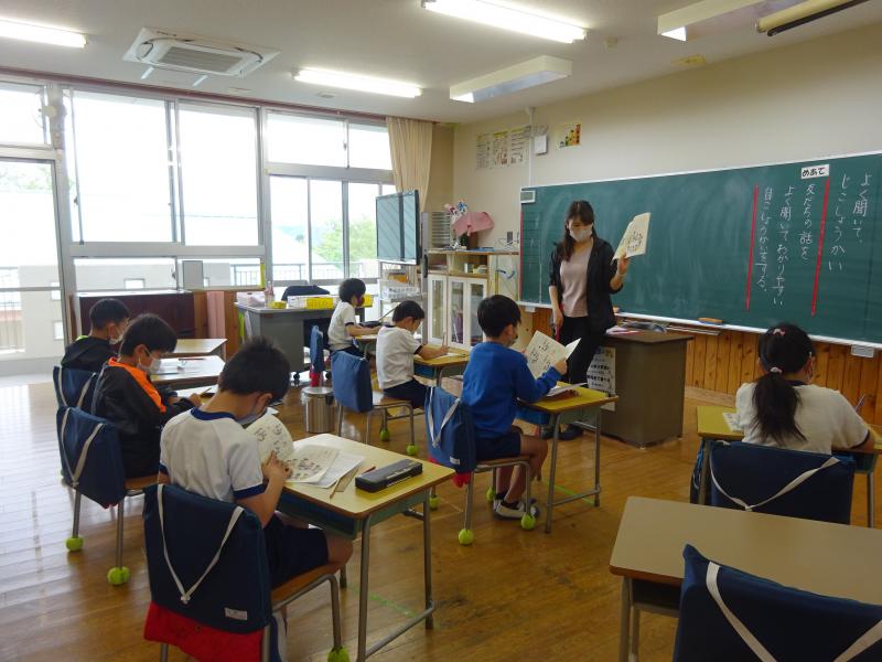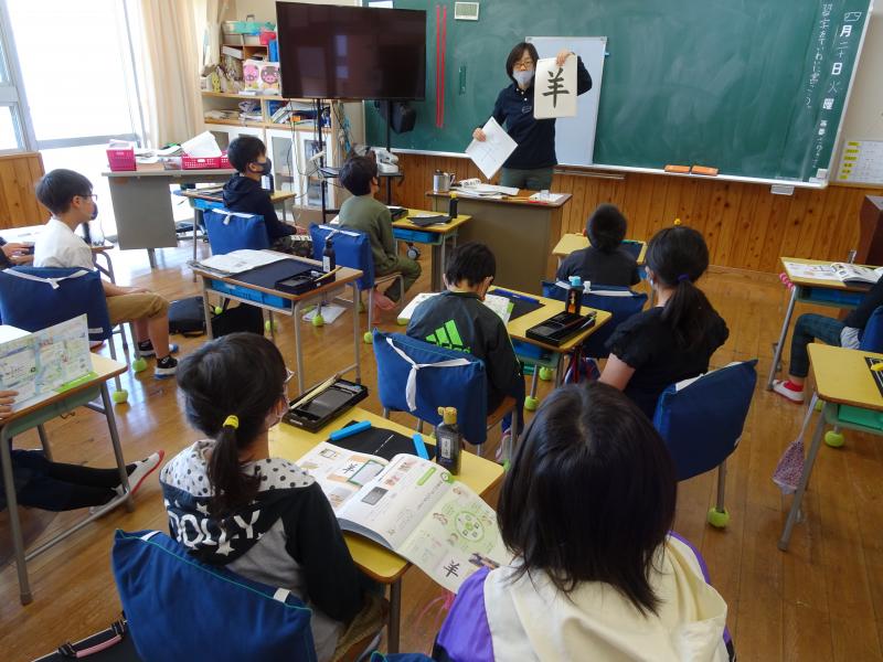 4年生は書写の時間、毛筆で「羊」と形よく書く練習でした。担任の岩永先生の説明を一生懸命聞いていました。上手に書けたかな?