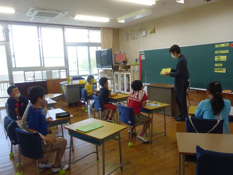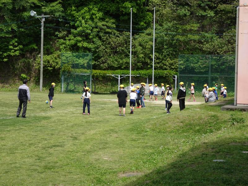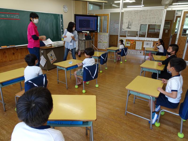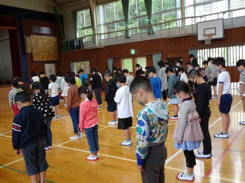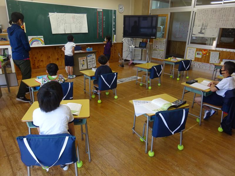1、2年生の合同の体育の学習です。ソーシャルディスタンスをとりながら、「1、2、3、4、・・・」上手に体操をしていました! 2年生が体操のやり方を1年生に教えてあげていました。立派なお兄さん、お姉さんです。