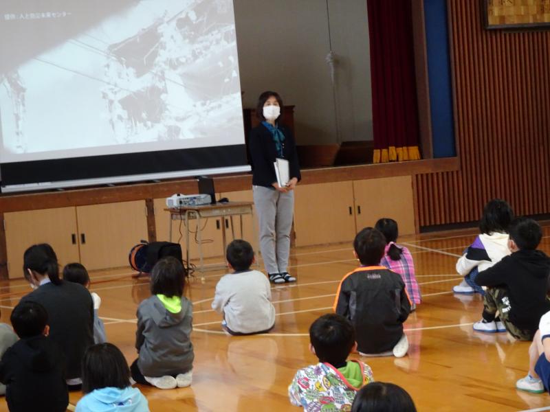 体育館に集まり、黙とうをして、校長先生から「備えることの大事さ」のお話を聞きました。枝川先生から避難する時の注意を聞いて、訓練です。