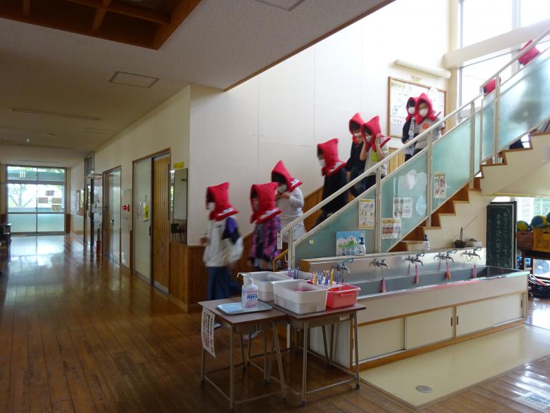 防災頭巾をかぶって、避難経路の確認をしました。今日の訓練で学んだことを忘れずに、自分の命は自分でしっかりと守りましょう。