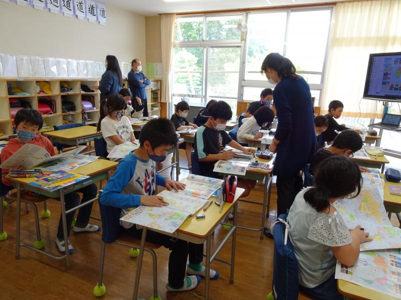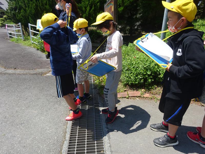 3年生は社会の勉強で地図作り。学校の近くを探検していました。方位磁針をもって、方角を調べながら「あっ、ここに交番がある!」と地図にかきこんでいました!