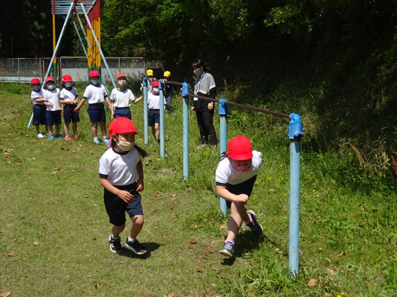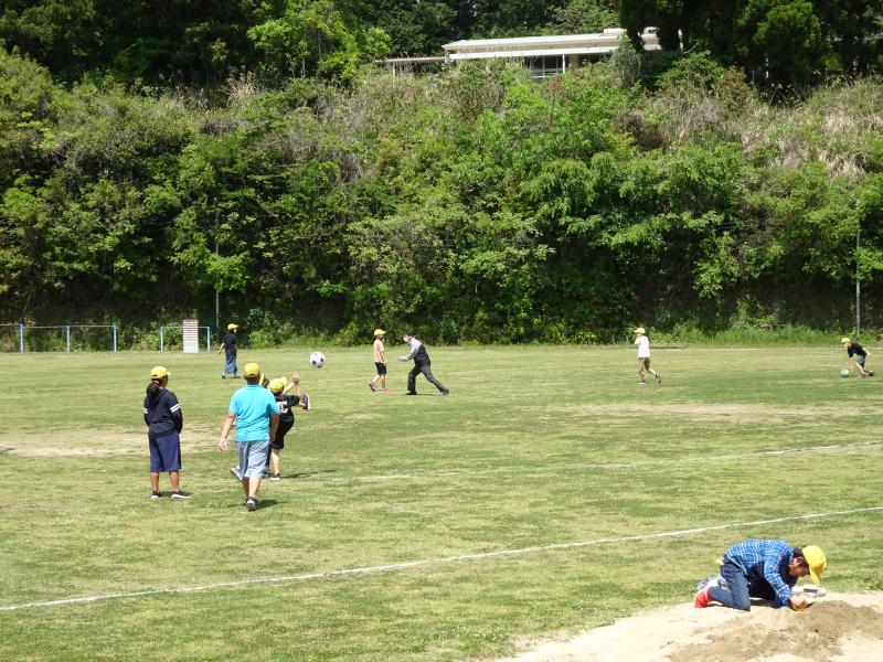 1年生は運動場で体育の勉強をしていました! 上り棒をスイスイ、鉄棒はくぐって、陣取りを楽しんでいました!