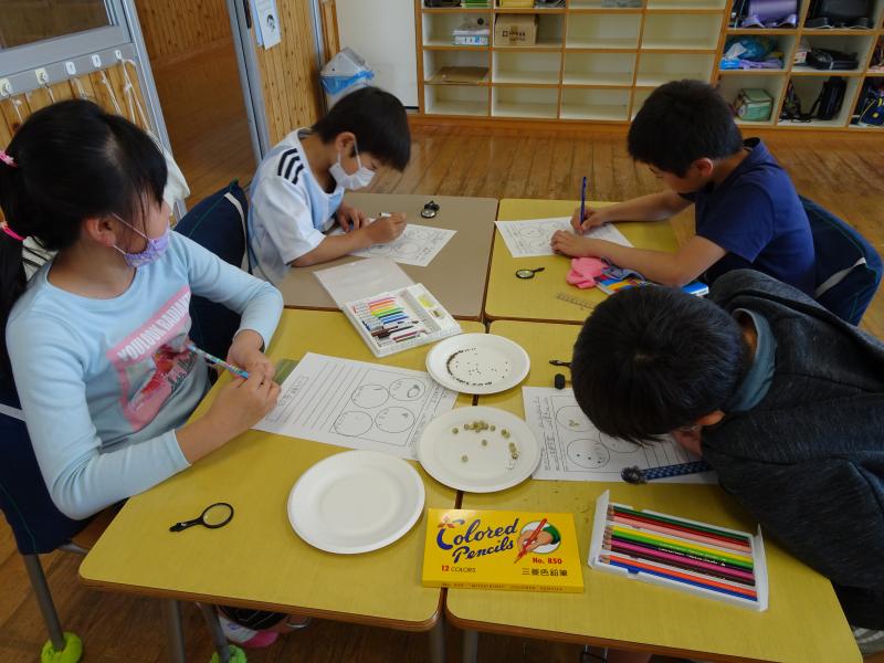 3年生の理科です。虫メガネを使ってじっくりとたねの観察をしてから・・・