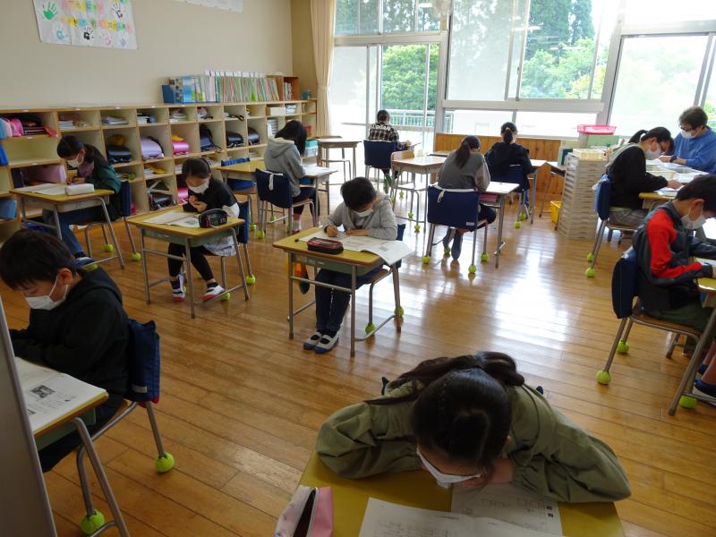 2年生にとっては初めての学力調査! 問題用紙のページをめくりながら、時間いっぱい最後まで頑張りました