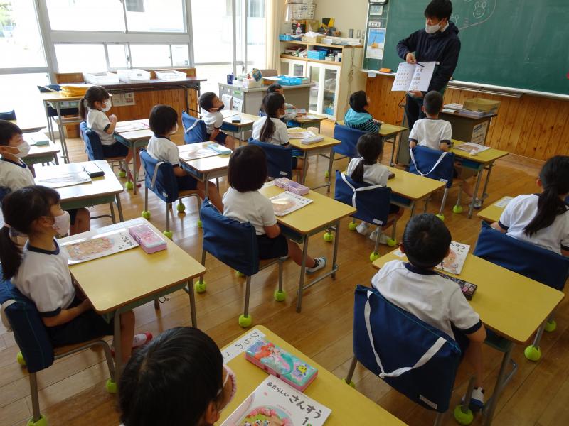 1年生は、音楽の勉強でした。「ひらいたひらいた」の歌を楽しく歌って、いろんな花を咲かせていました!