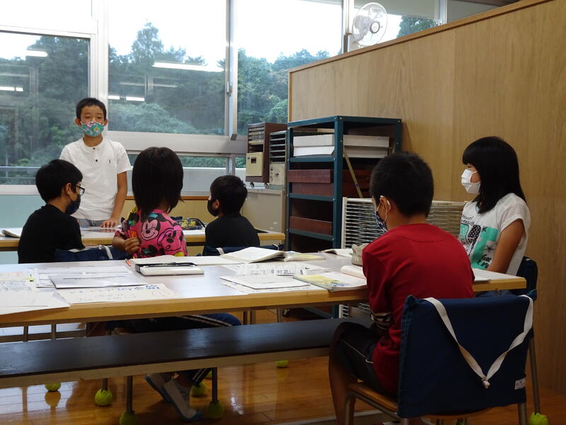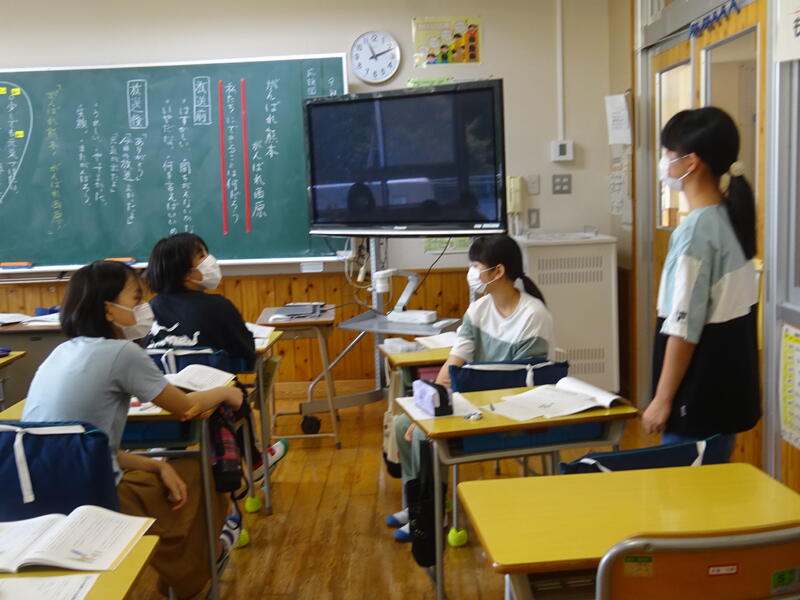 5年生の国語は「たずねびと」の学習で、各自でまとめた意見や考えを伝え合っていました。グループごとに分かれて、主人公「綾」をとおして戦争や原爆について考えたことを、自分の言葉で伝え、共感し合っていました。