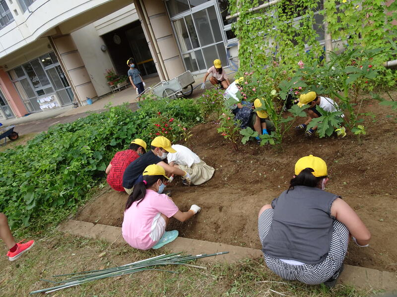 4年生の草取りの様子です。畑がどんどんきれいになっています