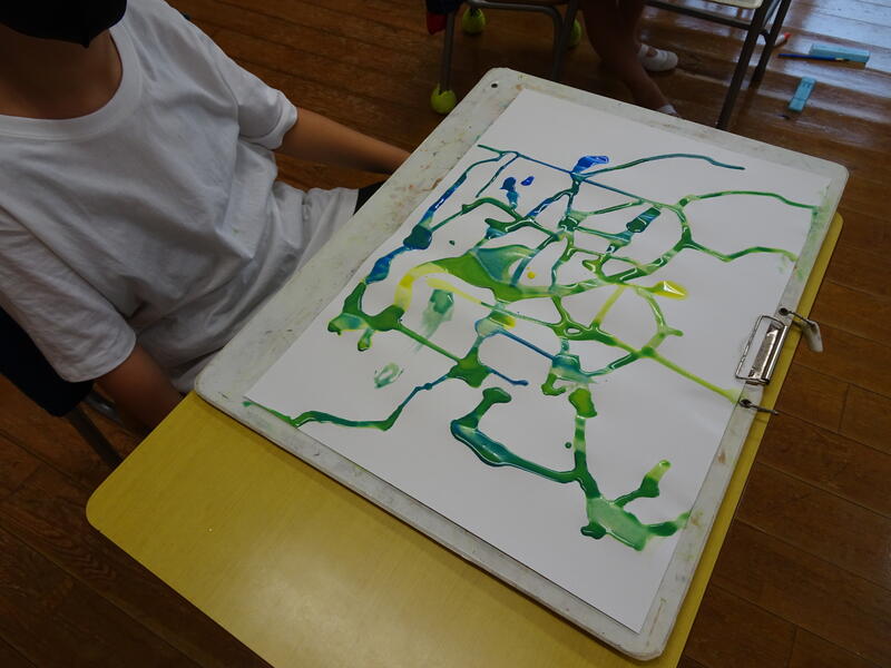 2年生は図工で絵の具をたらして迷路を作っていました!!