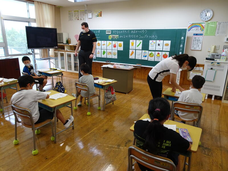 4年生の外国語活動の学習です。文房具の絵カードを選び、オリジナルの文房具セットを作って、みんなに紹介しました。
