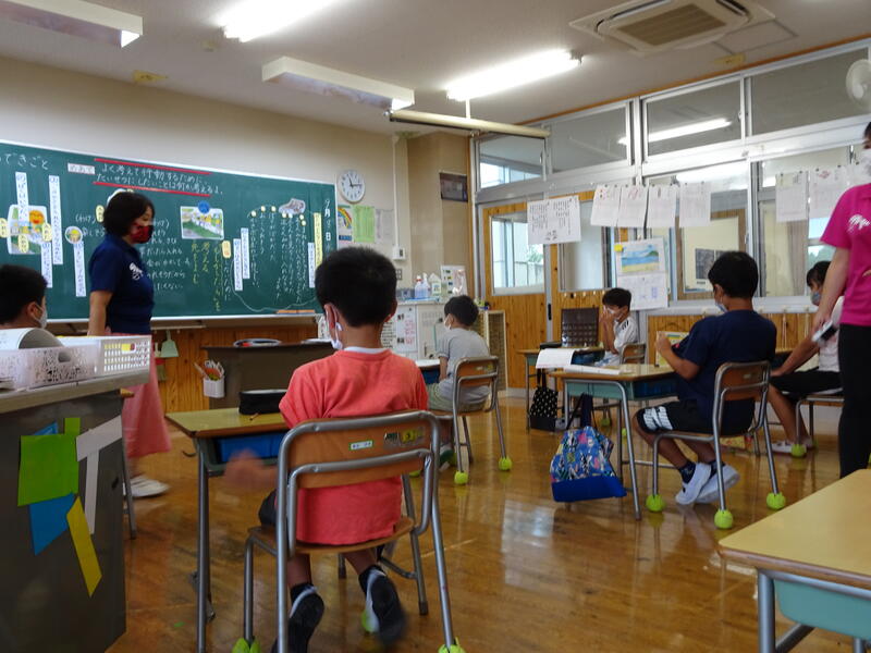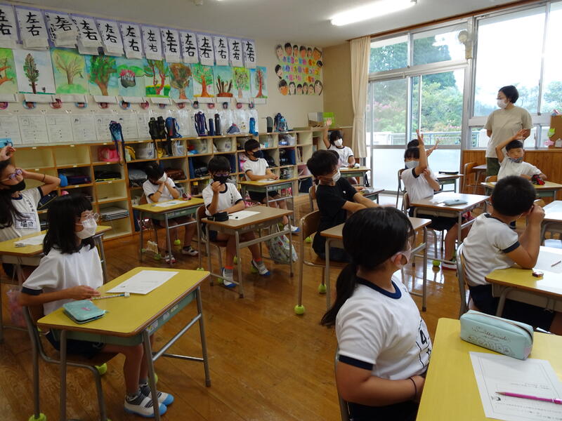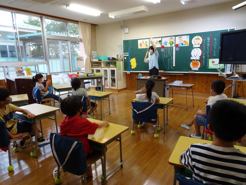 昼休みの「火曜集会」はリモートで、保健室から久保先生のお話でした。「タブレット使用と健康」について、①ぐうぺたぴんの姿勢、②画面との距離は30センチ以上離す、③30分したら1度休憩して遠くを見るの3つを聞きました。9月も健康で安全に生活しましょう!!