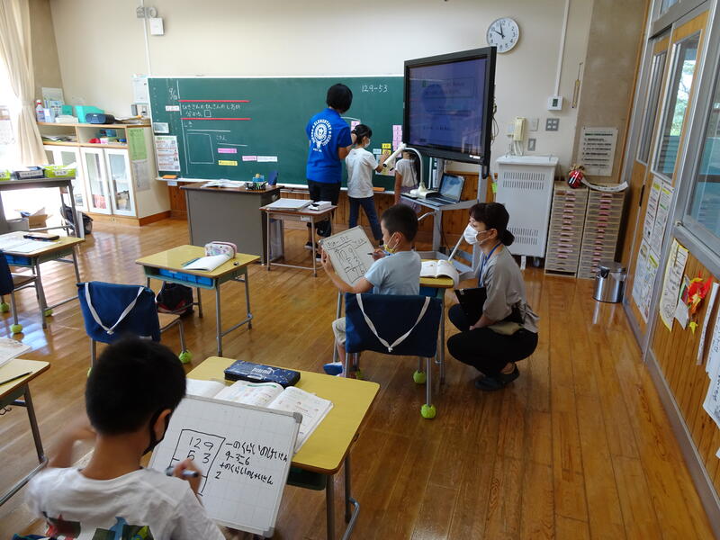 2年生の算数「ひき算」の学習です。筆算の仕方を考えたり、ホワイトボードを使って自分の考えを紹介したりしました。