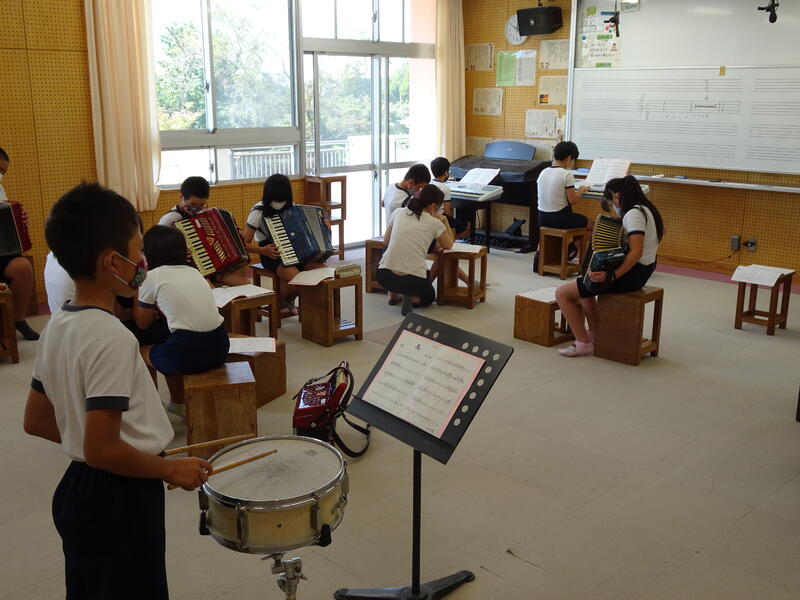 5年生の音楽の学習です。アコーディオンや小太鼓などの各パートに分かれて、テーマ曲「虹」の練習に取り組みました。