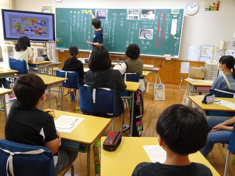 6年「千羽づるの少女」では、平和について考えました。人々はどうして折り続けるのか、友だちの考えをつなぎながら全員が考えを出し合い、世界の平和を願う気持ちを高めていました。