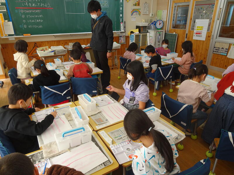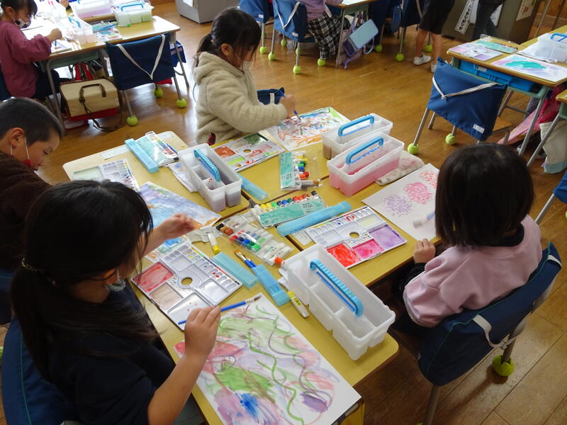 1年生は図工で絵の具セットを使って絵を描きました!! 絵の具のいろいろな色を混ぜて、とても楽しんでいました